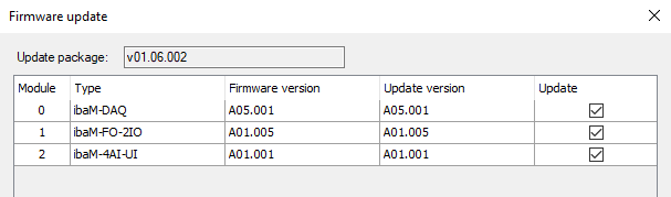 If the firmware version of a module does not match the version included in the firmware package or if no firmware is included for this module in the firmware package, an exclamation mark appears.