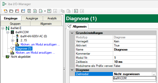 Ein Diagnosemodul wird erst nach Zuweisung zu einem ibaM-COM-Modul aktiv und stellt dessen Verbindungsinformationen zur Verfügung.