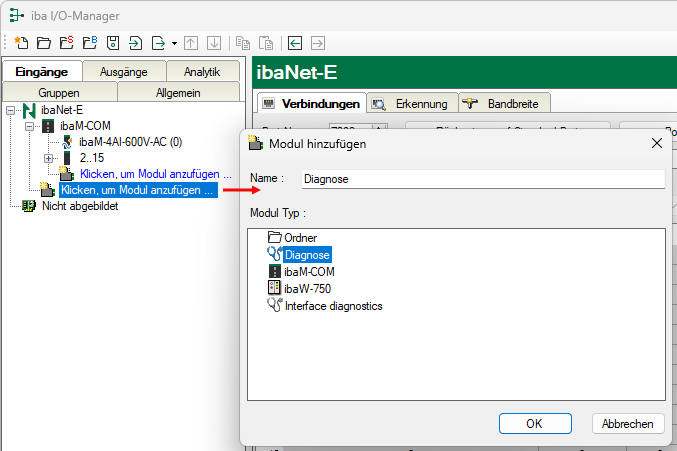 Klicken Sie auf den Link Klicken, um Modul anzufügen unter ibaNet-E.