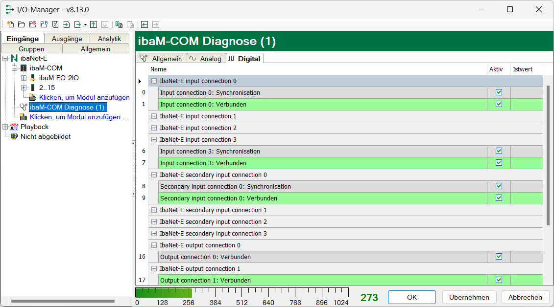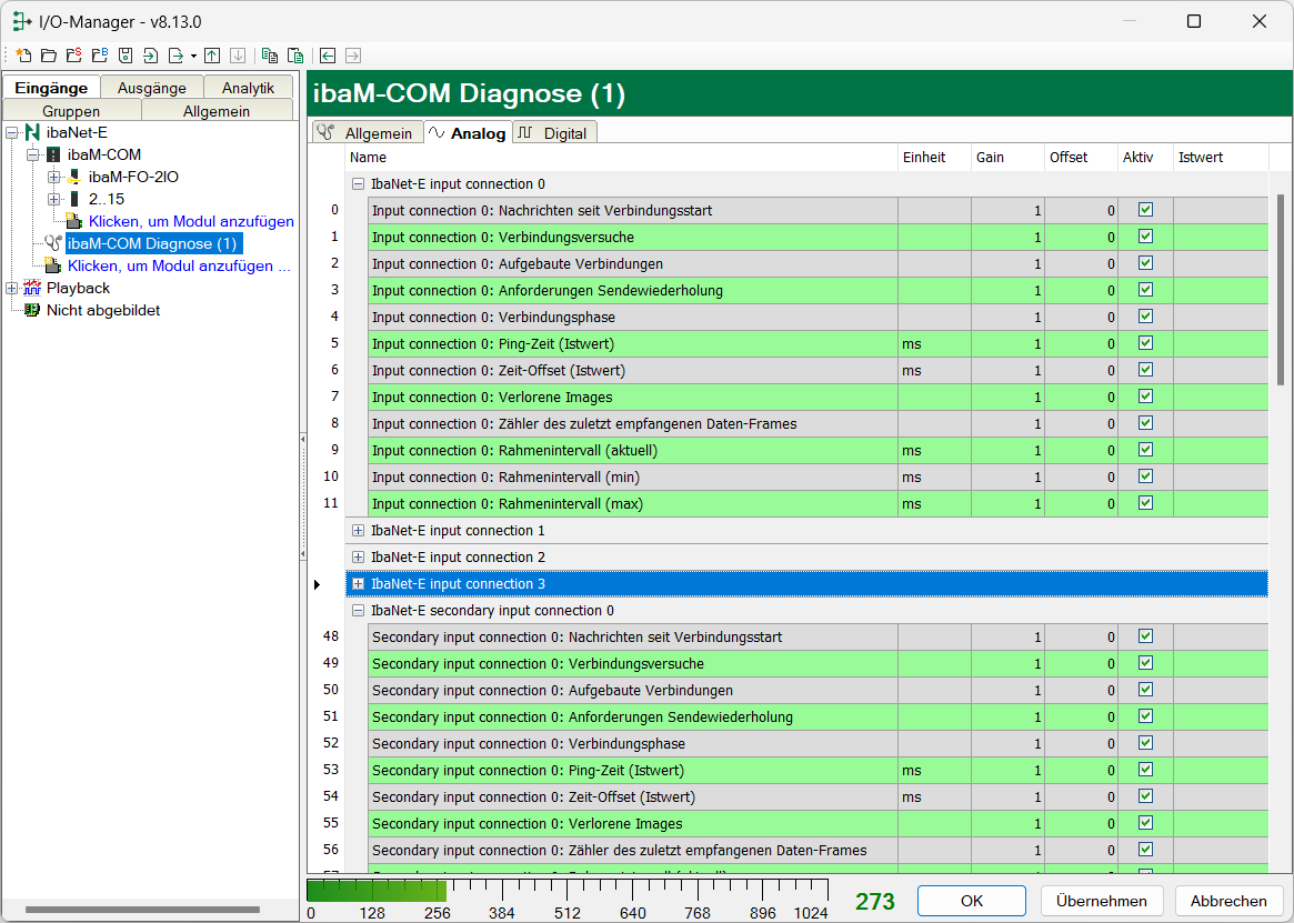 In den Registern Analog und Digital werden nach der Zuweisung automatisch die verfügbaren Diagnosesignale angelegt.
