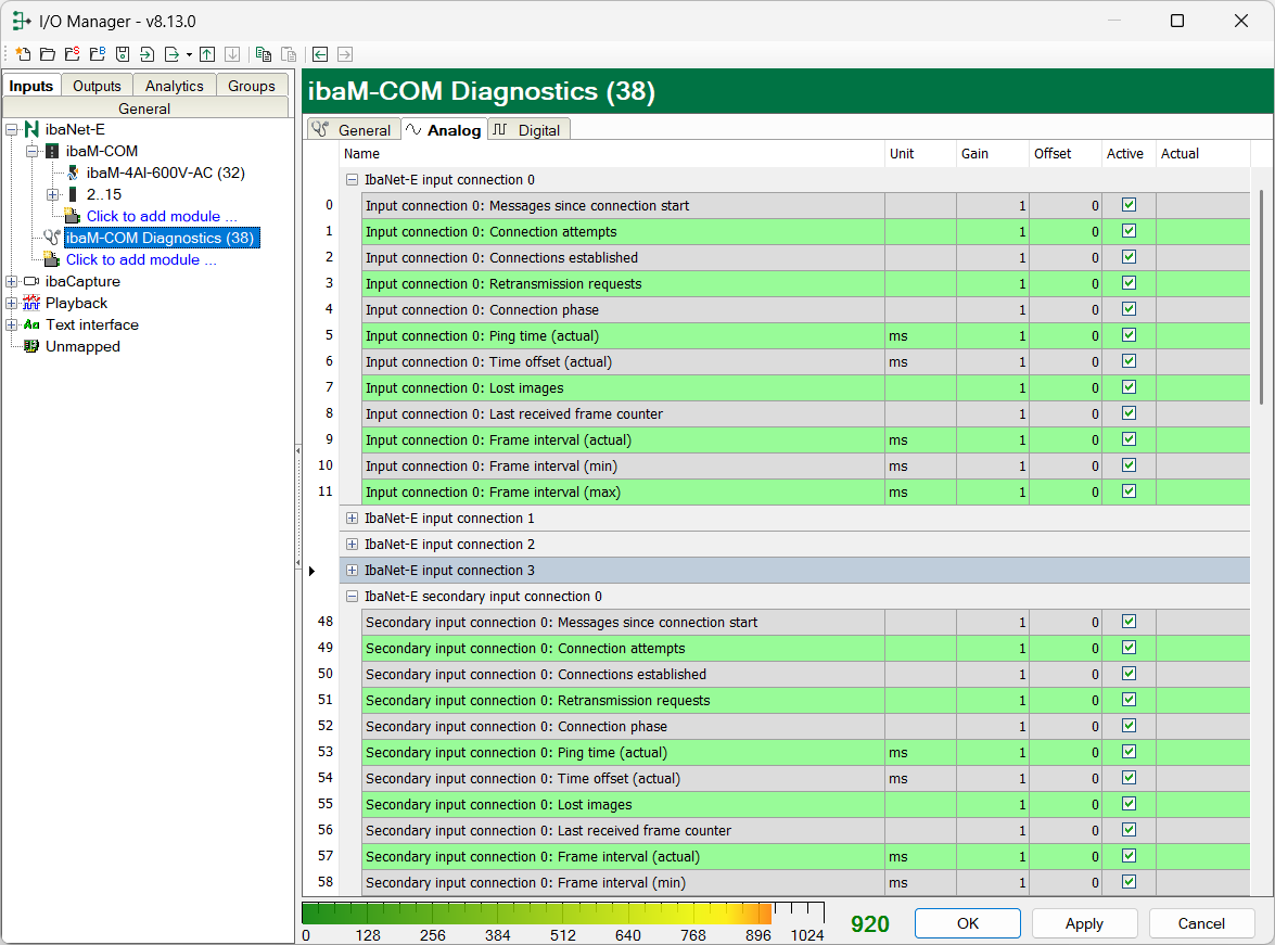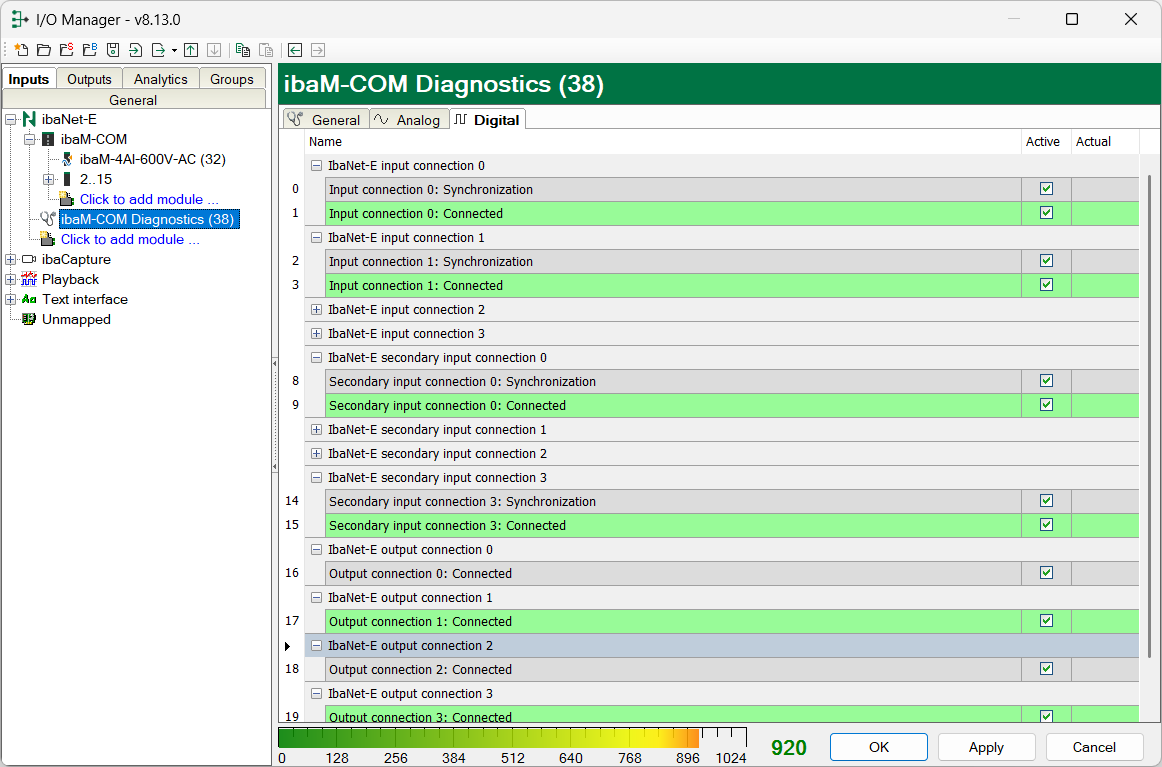 After assignment, the available diagnostic signals are automatically generated in the Analog and Digital tabs.