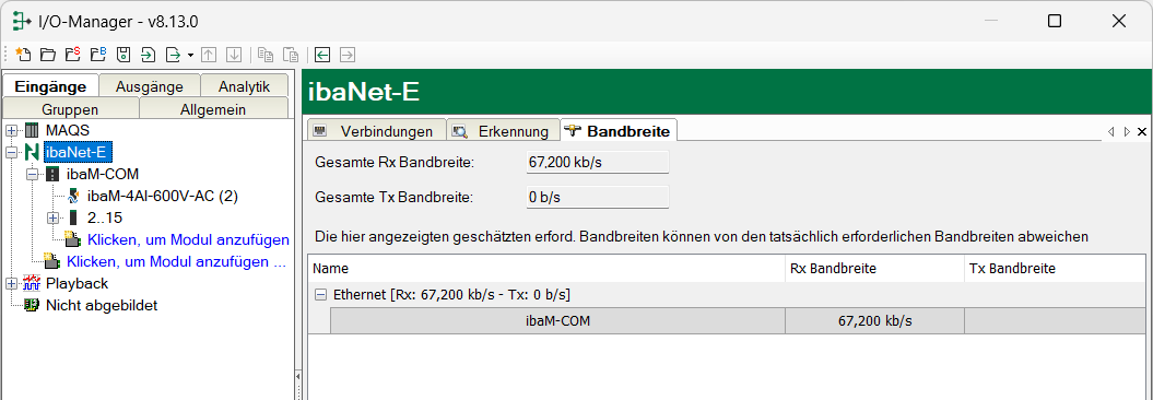 Das Register Bandbreite informiert über den Datendurchsatz der ibaNet-E-Schnittstelle. Angezeigt wird der geschätzte Datendurchsatz in Sende- und Empfangsrichtung insgesamt, sowie der Datendurchsatz, aufgeschlüsselt auf die verbundenen ibaNet-E-Geräte.