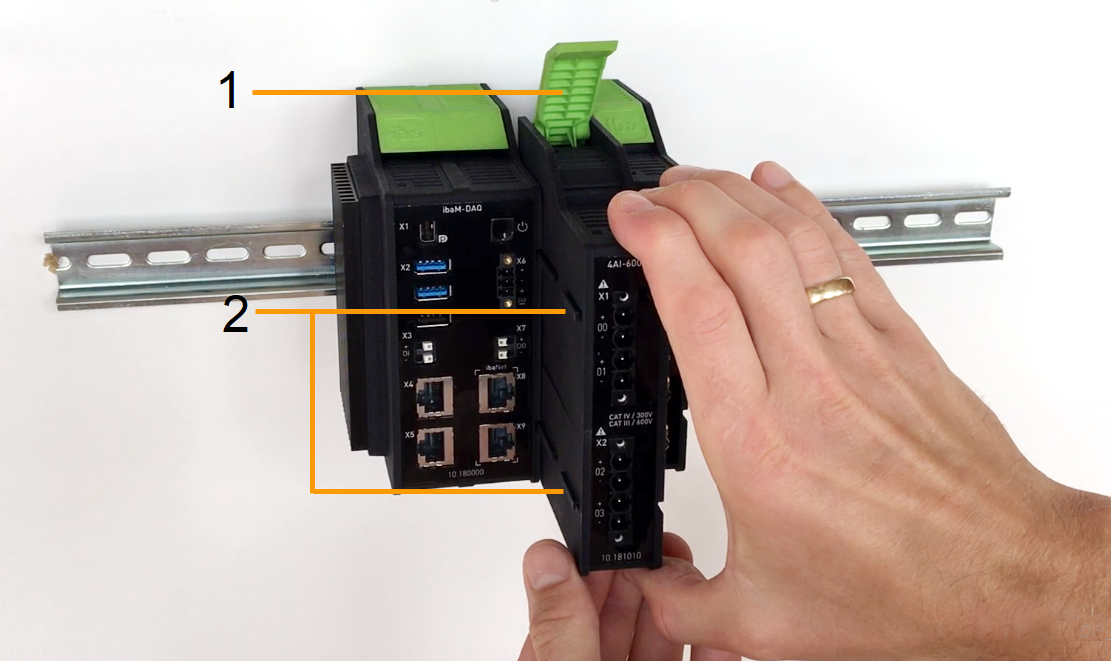 Grasp the module at the top and bottom with one hand and lift the green lever upwards to release the lock on the DIN rail.