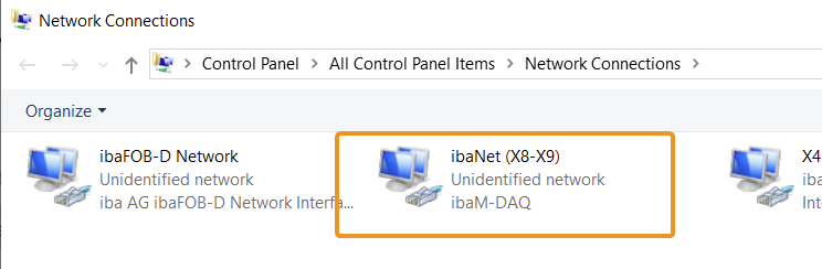 Die ibaNet-Anschlüsse X8 und X9 erscheinen in den Windows-Netzwerkeinstellungen auch als Netzwerkkarte. Da X8 und X9 mit Switch-Funktion ausgeführt sind, werden diese nur als eine Netzwerkkarte in Windows abgebildet: