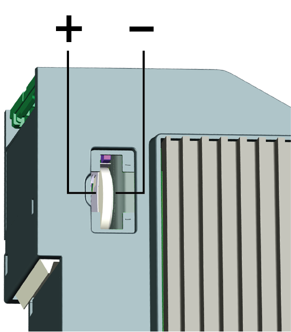 The internal time is buffered with a 3V Lithium BR2032 battery. The battery can be replaced during operation. Only batteries of type BR2032 may be used as replacements.