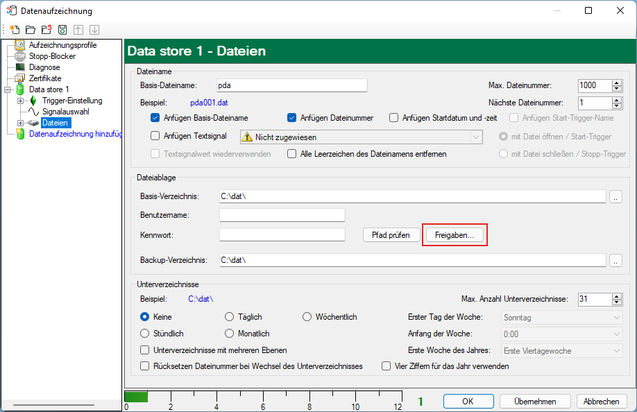 Um auf die mit ibaPDA aufgezeichneten Messdateien komfortabel über das Netzwerk zugreifen zu können, bietet der ibaPDA-Client die Möglichkeit, eine schreibgeschützte Freigabe einzurichten. Öffnen Sie den Dialog Datenaufzeichnung in ibaPDA und markieren den Knoten Dateien.