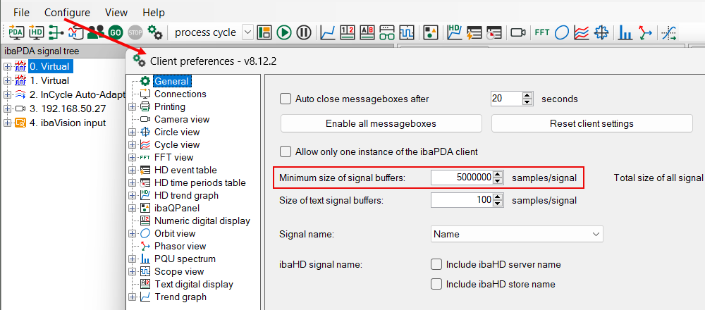 To obtain a complete display of the trend graph, the minimum size of the signal buffer must be increased in the client preferences (default 100,000). The maximum size is 100,000,000.