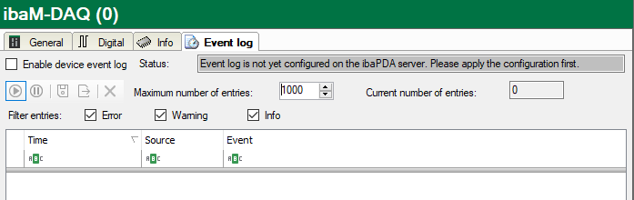 In the Event log tab, the status changes of the ibaM-DAQ device are documented in a list.
