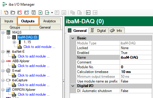 Most of the basic settings apply to the input and output module. The Calculation timebase and Minimum output timebase settings are only available for the output module.