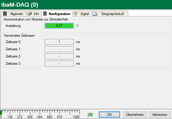 Die Auslastung dieser Schnittstelle hängt von verschiedenen Faktoren ab, hauptsächlich vom typ. Datendurchsatz von 512 Mbit/s, den verwendeten Zeitbasen und den konfigurierten Signalen in ibaPDA.