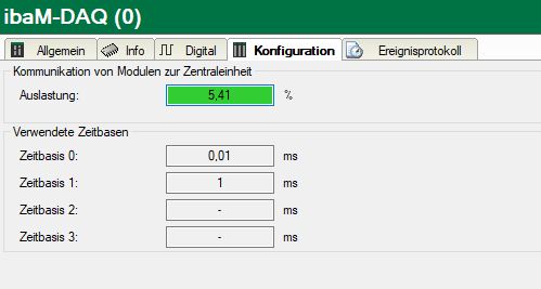 Die Auslastung dieser Schnittstelle hängt von verschiedenen Faktoren ab, hauptsächlich vom typ. Datendurchsatz von 512 Mbit/s, den verwendeten Zeitbasen und den konfigurierten Signalen in ibaPDA.
