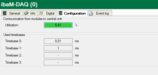 The utilization of this interface depends on various factors, mainly the typical data throughput of 512 Mbit/s, the timebases used, and the signals configured in ibaPDA.