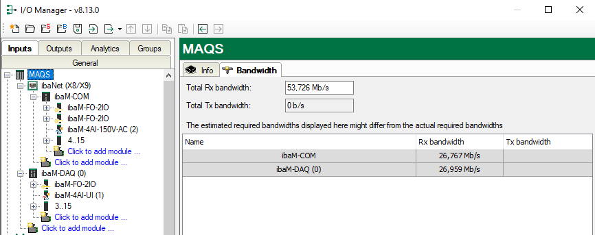 The Bandwidth tab provides information about the data throughput of the module-module interface, including the ibaNet (X8/X9) interface. The estimated data throughput in the transmit and receive directions is displayed, as well as the data throughput of the connected modules.