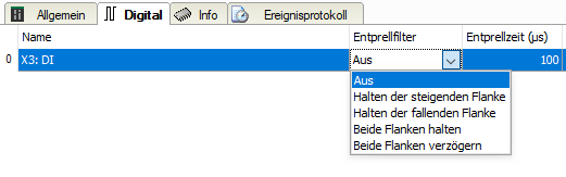 Über ein Drop-down-Menü können Sie die Betriebsart des Entprellfilters auswählen. Mögliche Einstellungen: aus, Halten der steigenden Flanke, Halten der fallenden Flanke, beide Flanken halten, beide Flanken verzögern.