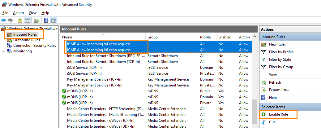 Wählen Sie zuerst die eingehenden Regeln (Inbound Rules) aus und selektieren in der Liste der eingehenden Regeln nach diesen beiden Regeln: