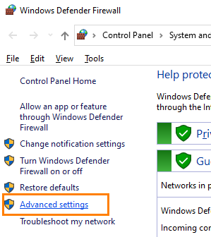 Open Windows Defender Firewall (e.g. via settings and searching for "firewall").