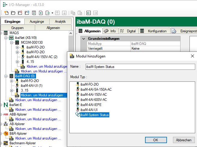 Klicken Sie auf den Link Klicken, um Modul anzufügen unter ibaM-DAQ.