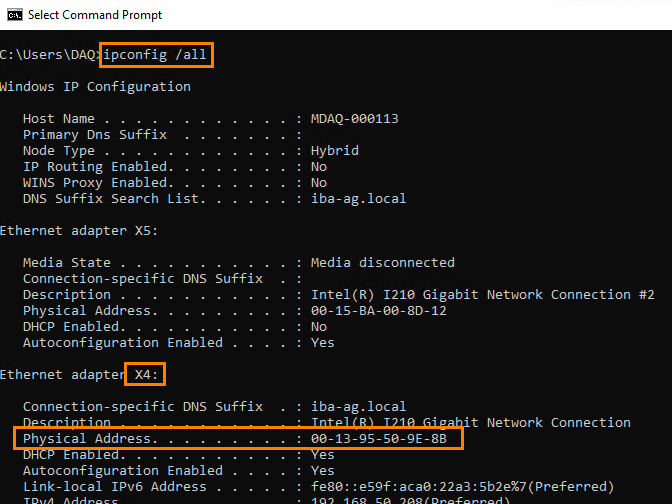 The MAC address can be identified by opening a command prompt ("cmd") on the ibaM-DAQ device and entering "ipconfig /all" as command: