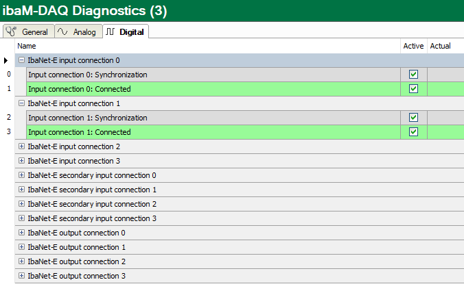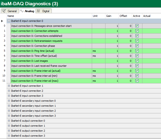 A feature of the connection quality for the Ethernet: In regular operation, a ping to the ibaNet-E device is performed every one second and the measured time is displayed here. The shorter this time is, the better the connection quality and the more reliable the data transmission. For the synchronization at the start of the acquisition and sporadically during the acquisition, this ping is performed at a much higher frequency.