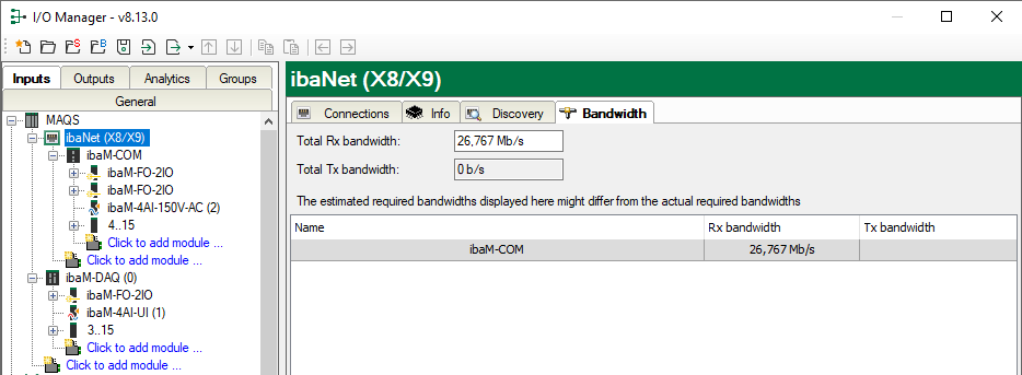 The Bandwidth tab provides information about the data troughput of the ibaNet (X8/X9) interface. The estimated total data troughput in the transmit and receive direction is displayed here, as well as the data troughput for the connected ibaNet-E devices.