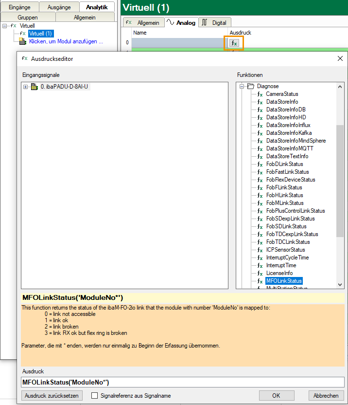 Mit dem Ausdruckseditor können spezielle virtuelle Funktionen für die Diagnose und zur Überwachung der LWL-Verbindungen ausgewählt werden. Diese stehen dann als sog. virtuelle Signale zur Verfügung und geben den aktuellen Status der Verbindung wieder. Diese Signale können in ibaPDA aufgezeichnet und weiter verarbeitet werden.