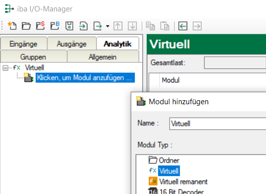 Im Register Analytik im I/O-Manager können Sie virtuelle Module hinzufügen. Klicken Sie dazu auf den Link unter der Schnittstelle Virtuell und wählen den Modultyp Virtuell aus.