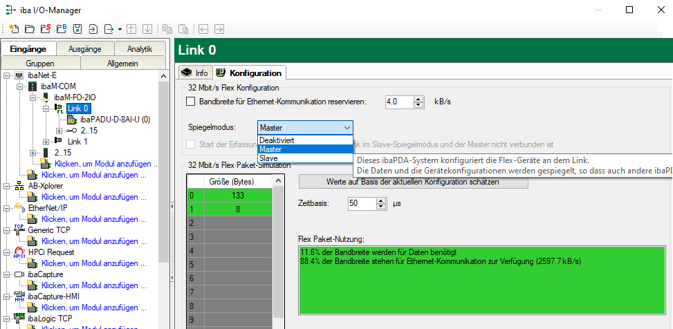 • Master: Dieses ibaPDA-System konfiguriert die Flex-Geräte an diesem Link. Die Daten und Gerätekonfigurationen werden gespiegelt, so dass auch andere ibaPDA-Systeme die Daten erfassen können.