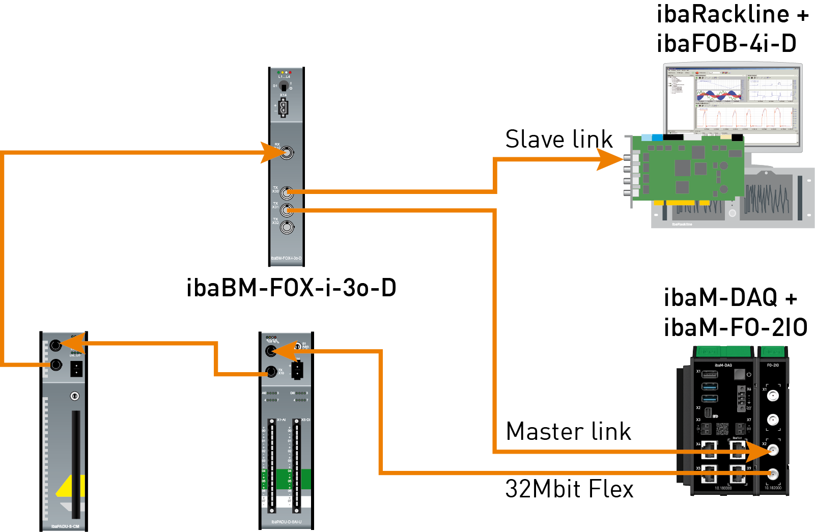 Der LWL-Ausgang des letzten Flex-Geräts wird mit dem LWL-Eingang eines ibaBM-FOX-i-3o-D-Geräts verbunden. Je ein LWL-Ausgang von ibaBM-FOX-3o-D wird mit dem LWL-Eingang des ibaPDA-Master und des ibaPDA-Slave verbunden.
