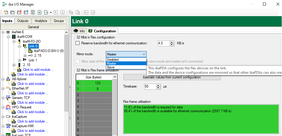 Master: This ibaPDA system configures the Flex devices on this link. The data and the device configurations are mirrored so that other ibaPDA systems can also acquire the data.