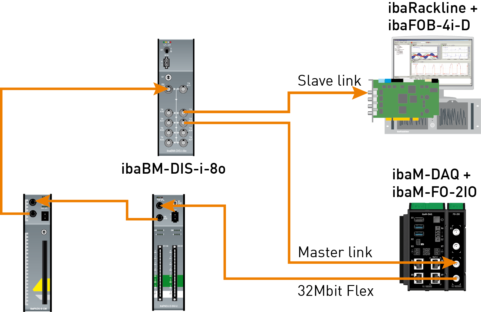 The fiber optic output on the last Flex device is connected to the fiber optic input on an ibaBM-FOX-i-3o-D device. One fiber optic output on the ibaBM-FOX-3o-D device is connected to a fiber optic input on the master ibaPDA system; another output is connected to an input on the slave ibaPDA.