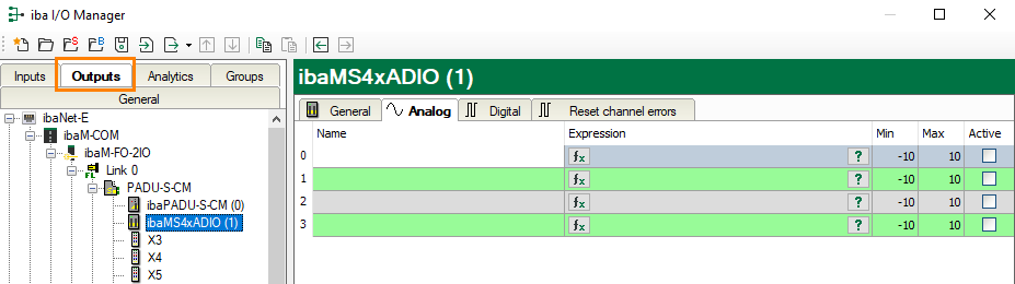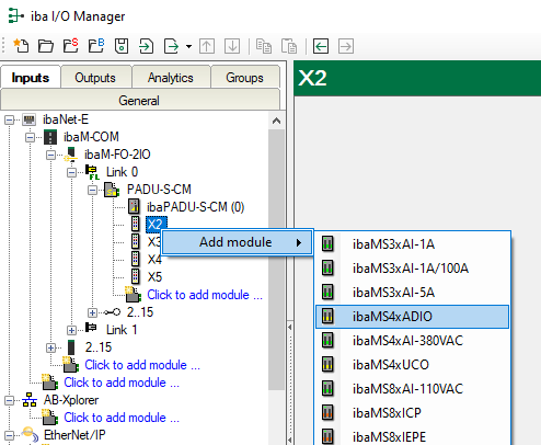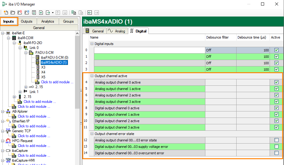 Modules, such as a mixed module with digital and analog inputs and outputs as shown in this example (ibaMS4xADIO), can be added both in the Inputs and the Outputs tab.
