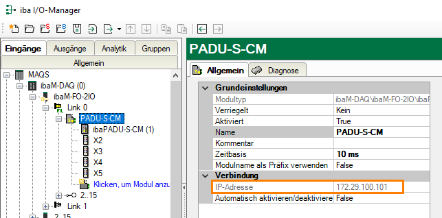 Die IP-Adresse der Flex-Geräte wird im I/O-Manager im Register Allgemein angezeigt und kann nicht verändert werden.