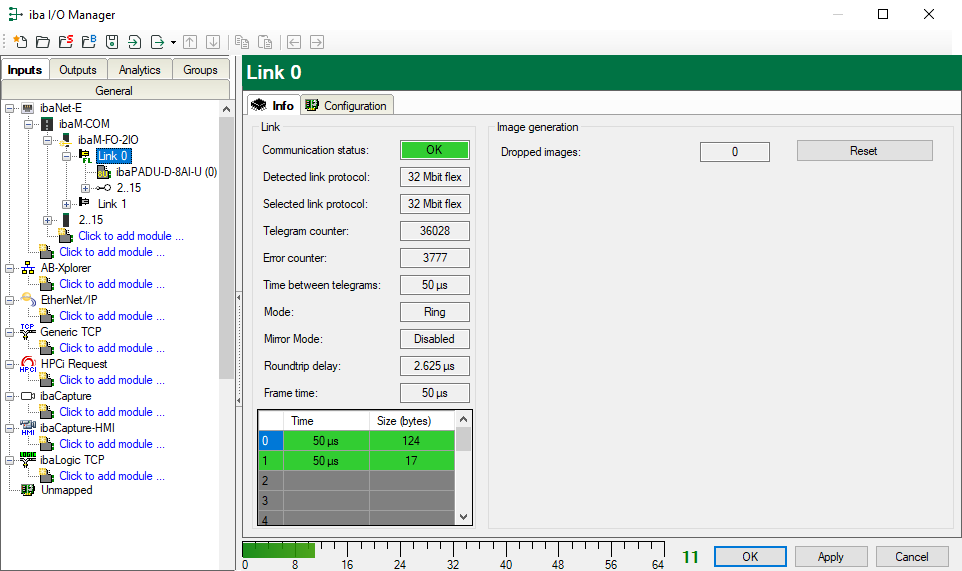 Up to 15 devices can be connected in a ring topology per link. In the signal tree on the left side, the links 1 – 15 below the ibaM-FO-2IO correspond to the address set by the rotary switch on the connected device.