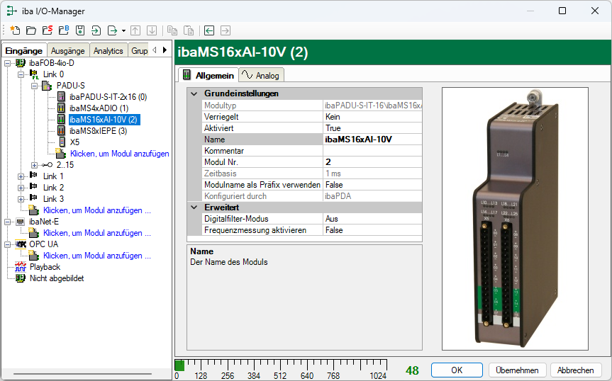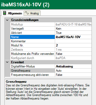 Ist das Modul erkannt, klicken Sie auf das Modul in der Baumstruktur und das Register Allgemein öffnet sich. Die Register Allgemein und Analog sind für alle ibaMS16xAI-Module gleich.