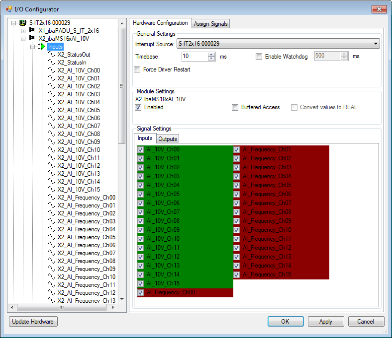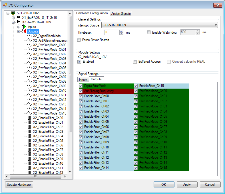 You need to apply the buffered access by clicking on the <Apply> button. Only then, you will see additional signals in the signal tree that can be configured as output or input resources. |