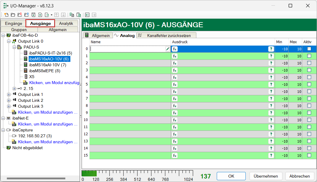Wählen Sie das Register Ausgänge, um Einstellungen für die Ausgangssignale festzulegen. Im Register Analog nehmen Sie folgende Einstellungen vor: