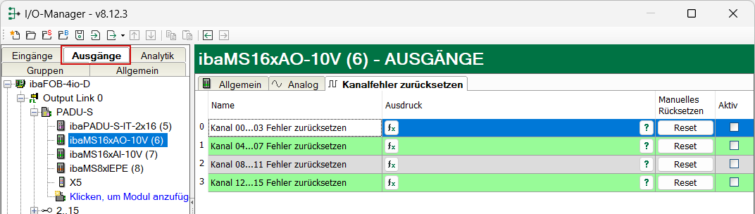 Im Register Ausgänge, im Register Kanalfehler zurücksetzen können Hardware-Fehler der Viererwurzel über zwei Wege zurückgesetzt werden: