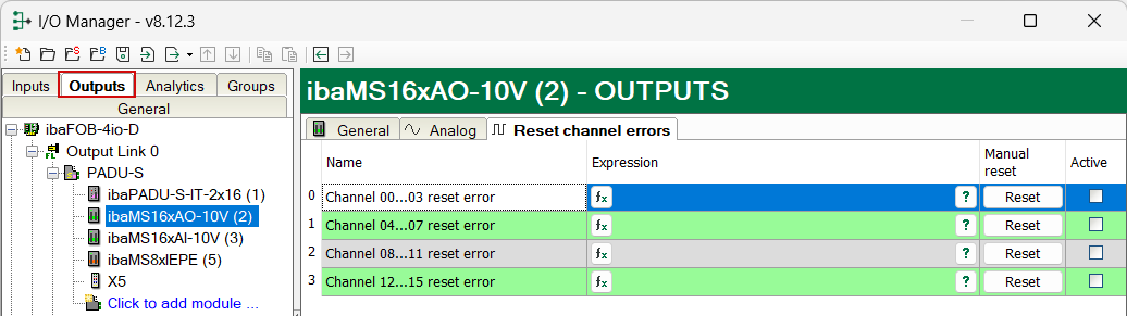 In the Outputs tab, under Reset channel errors, hardware errors in the quad root can be reset in two ways: