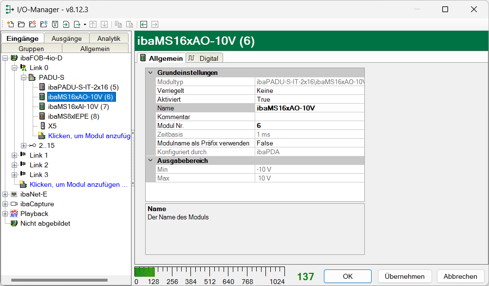 Ist das Modul erkannt, klicken Sie auf das Modul in der Baumstruktur und das Register Allgemein öffnet sich.