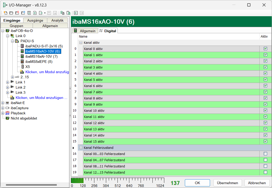 Im Register Digital können Sie Status- und Fehlerinformationen aktivieren: