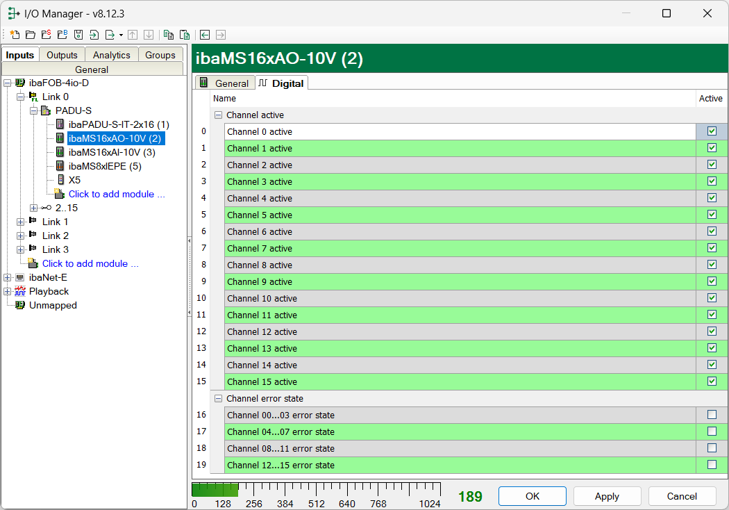 You can activate channel and error state for each channel in the Digital tab.