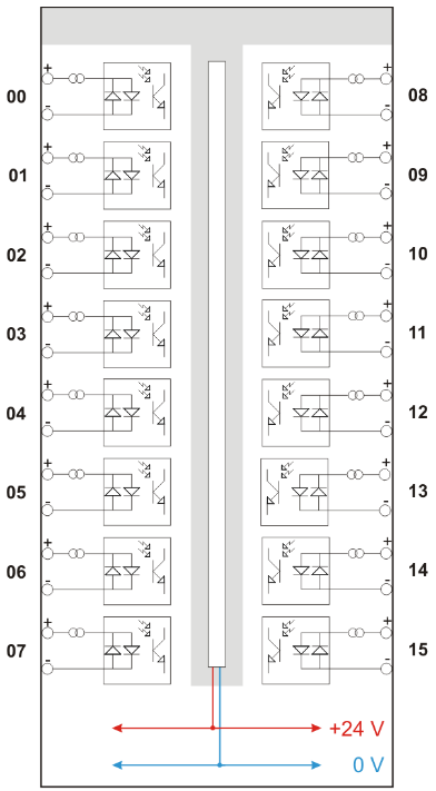 Hier können 16 Eingangssignale (0...15), jeweils zweipolig und potenzialgetrennt, angeschlossen werden. Jeder Kanal wird mit Zweidrahttechnik angeschlossen. Durch den Verpolungsschutz wird das Messsignal logisch richtig angezeigt, auch wenn der Anschluss verpolt ist.