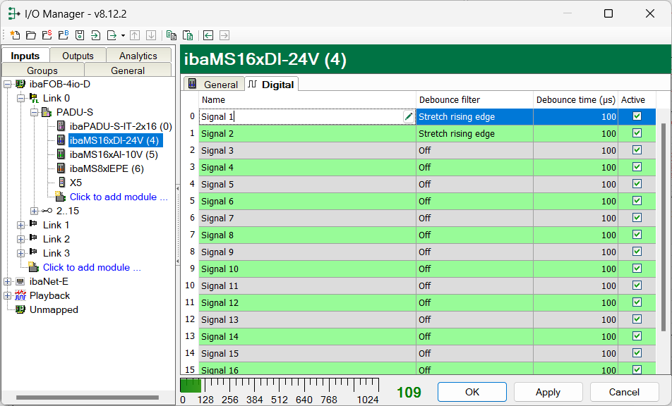 In the drop-down menu, you can choose the operating mode for the debounce filter. The following settings are available: Off, Stretch rising edge, Stretch falling edge, Stretch both edges, Delay both edges
