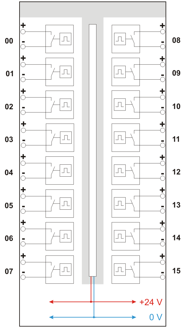 16 Ausgangssignale (0...15), jeweils zweipolig und potenzialgetrennt, können angeschlossen werden. Jeder Kanal wird mit Zweidrahttechnik angeschlossen.