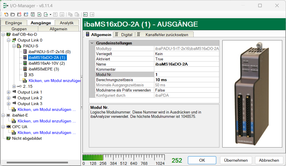 Die meisten Grundeinstellungen gelten für das Eingangs- und Ausgangsmodul. Die Einstellungen Berechnungszeitbasis und Minimale Ausgangszeit gibt es nur beim Ausgangsmodul.