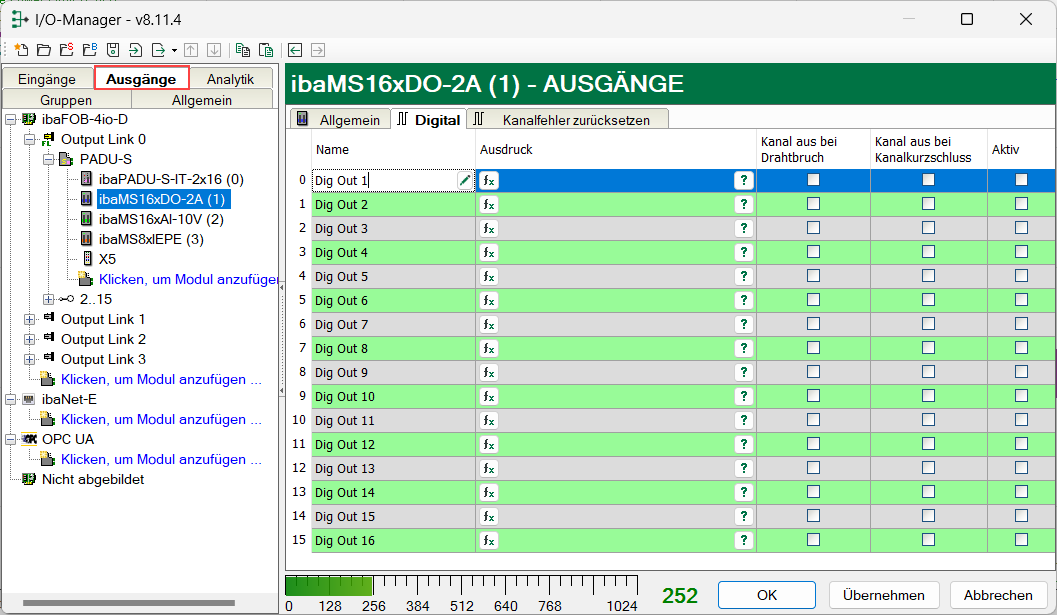 Wählen Sie das Register Ausgänge um Einstellungen und Signale ausgangsseitig festzulegen.