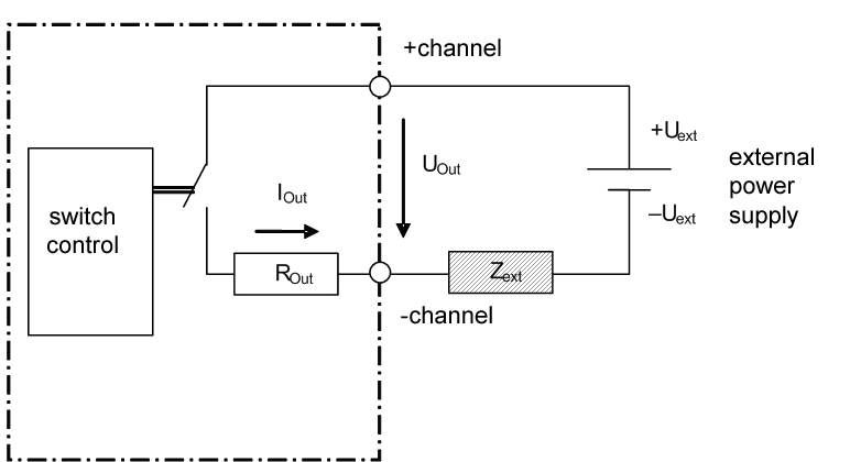 The connected load Zext is connected to –Uext and switched on +Uext by means of the controllable switch (load switch) in the output channel. This typical circuit is shown schematically in the following figure.