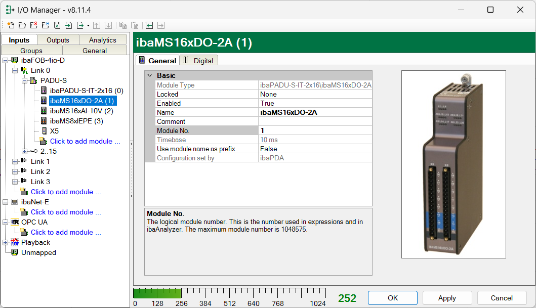 This internal reference number of the module determines the order of the modules in the signal tree of ibaPDA client and ibaAnalyzer.