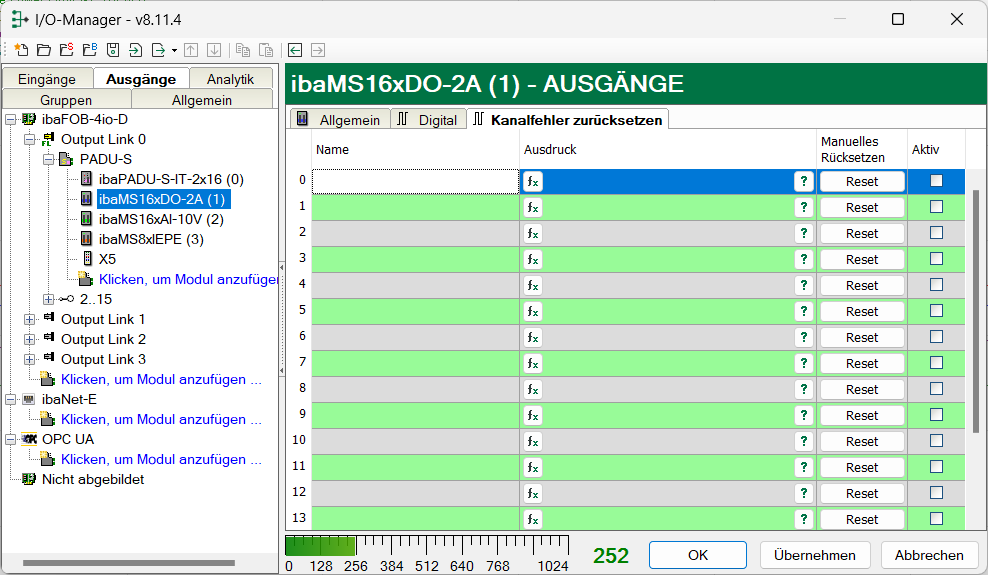 Im Register Ausgänge, im Register Kanalfehler zurücksetzen nehmen Sie folgende Einstellungen vor: