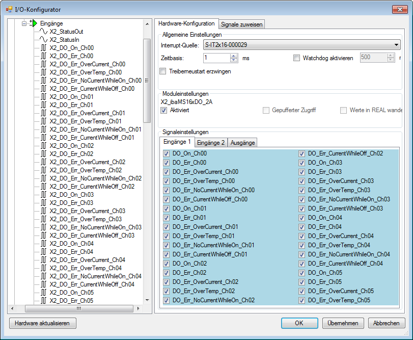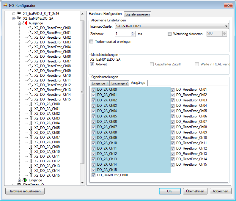 Die digitalen Ausgangskanäle sowie die Fehlerrücksetzsignale werden unter Ausgänge angezeigt.